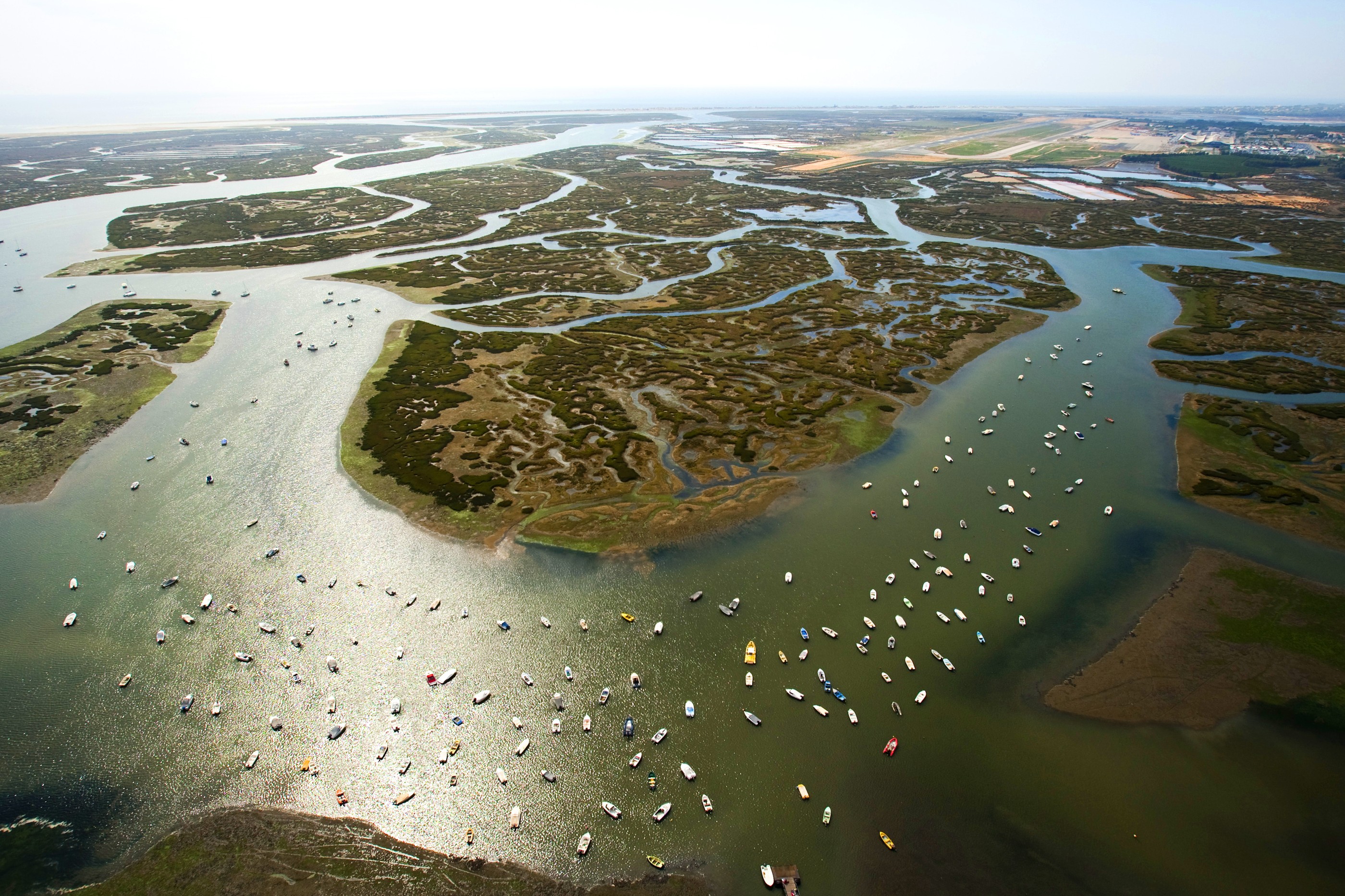 Vista aérea da Ria Formosa junto a Faro com vista para o aeroporto